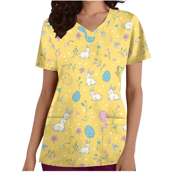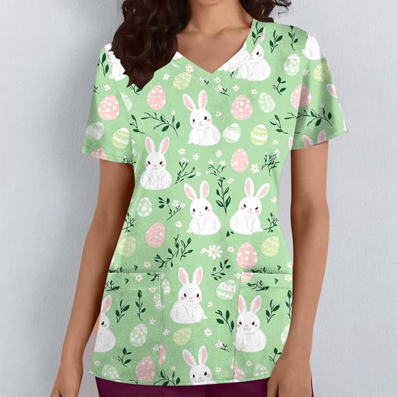 Jienlioq Womens Tops Summer Casual Women Fashion Casual Loose Easter Printed Pocket Short Sleeve V-Neck Nursing Uniform Top Green 3XLDelivery, in 5+ days