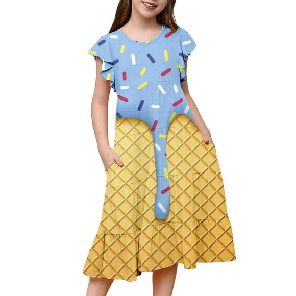 WEIYLL Summer Dresses Girls Trendy 2025 Sleeveless Fly Sleeve Toddler Kids Ice Cream Print Sky Blue Dress Clothes 5-6 YearsFree delivery, in 5+ days
