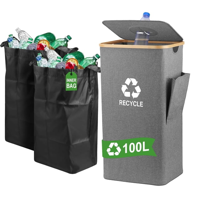 100L Recycling Bin with Lid for Home & Kitchen – 26-Gallon Large Indoor Trash Container, 2 Removable Reusable Bags for Sorting Bottles, Cans, Glass & Plastic (Grey)ipipip
