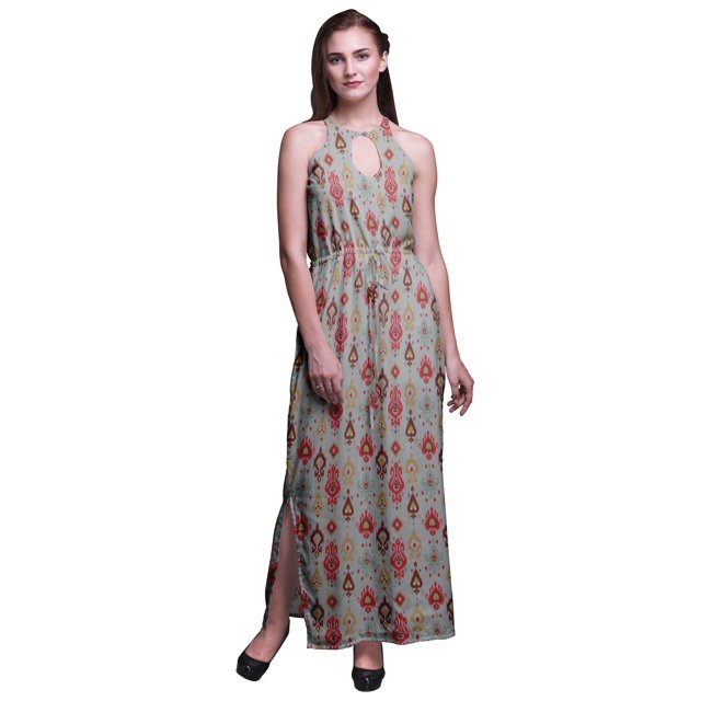 Bimba Ikat Ladies Crew Neck Waist String Print Maxi Dress with Side Slits Summer Wear-XX-Large
