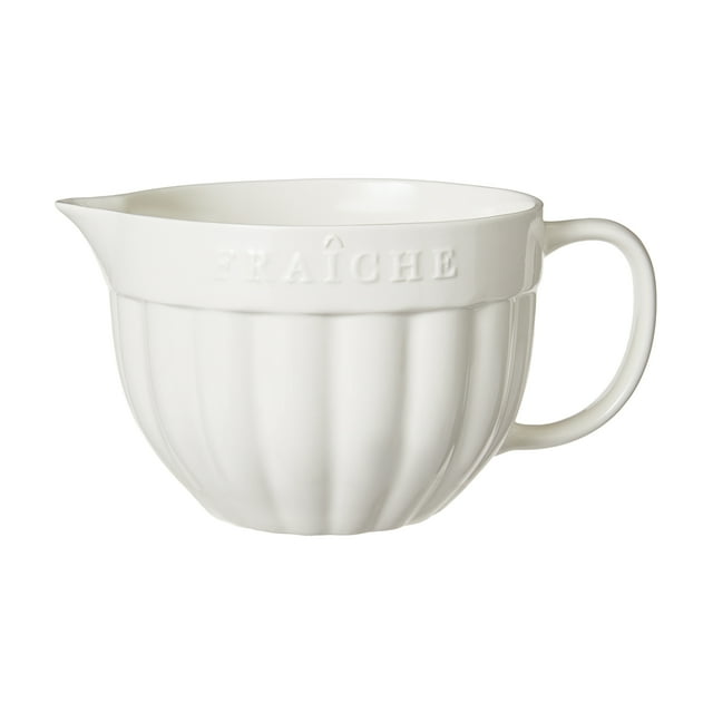 White ceramic Fraiche ribbed mixing bowl featuring a handle, pouring spout, and embossed brand name on the rim.