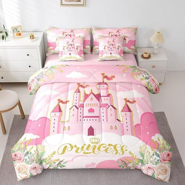 Girls Princess Comforter Set 7 Pieces Reversible,Cartoon Castle Pink Bed Set,Dreamy Fairy Tale Bedding Soft Microfiber Twin(1 Comforter,2 Pillowcase,2 Pillow Covers,1 Flat Sheet,1 Fitted Sheet)