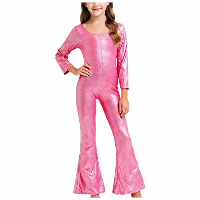 Girls Sequin Metallic Flared Jumpsuits Glitter Overalls Rompers Perform Dance Birthday Festival School Party