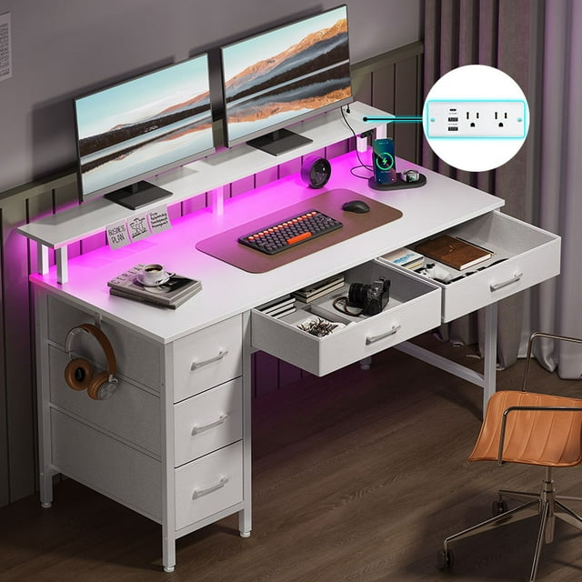 Greenstell 39" Gaming Computer Desk with LED Lights & Outlets,Home Office Table with Storage Drawer, White