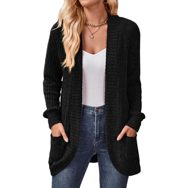 MAWCLOS Ladies Cardigan Sweater Long Sleeve Knitted Sweaters Solid Color Cardigans Cozy Work Open Front Black L