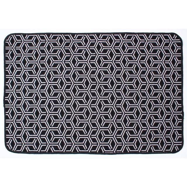 Radiance Accent Floor Mat (Brannon) featuring a 2' x 3' rectangular shape with black base and white interlocking hexagon design.