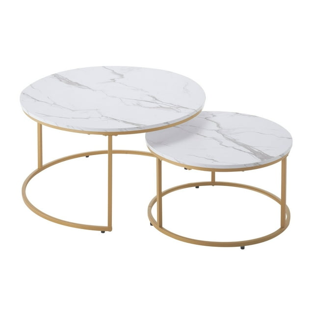 STAWAY Nesting Coffee Table Set of 2 - Modern White Marble & Gold, Versatile Round Tables for Living Room, Office, Space-Saving Design, Easy Assembly