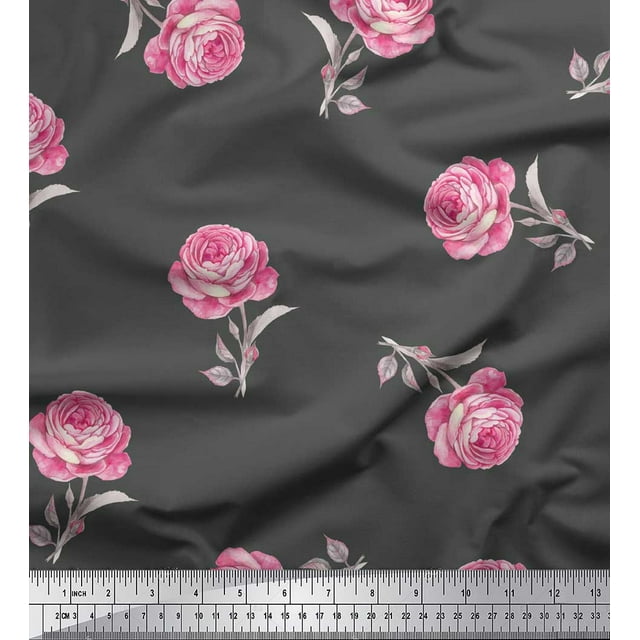 Soimoi Gray Rayon Crepe Fabric Grandiflora Roses Floral Print Fabric by the Yard 46 Inch Wide