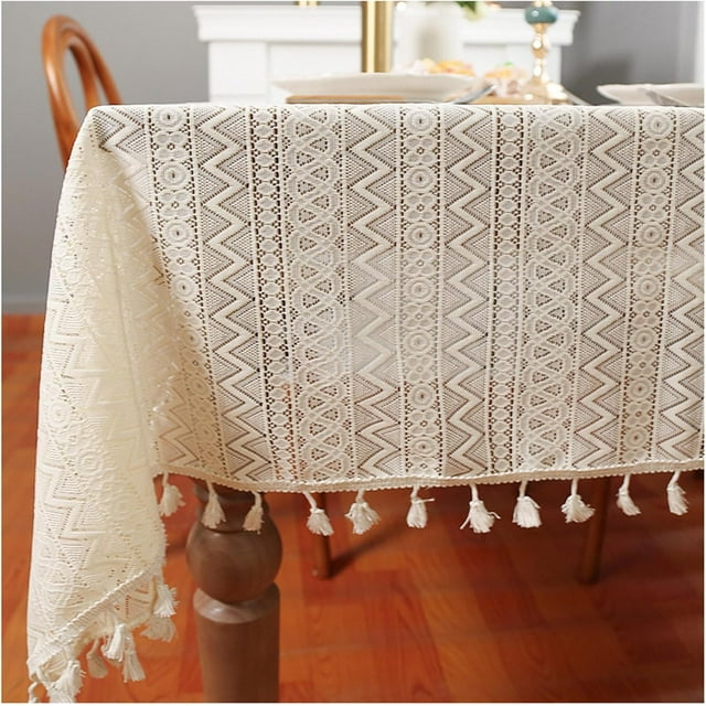 Textured Table Cloth for Rectangle Table, Farmhouse Tablecloth with Tassel Beige Lace Vintage Diamond Kitchen Tablecloths for Rectangle Tables or Party Banquet Dining Wedding Decorations