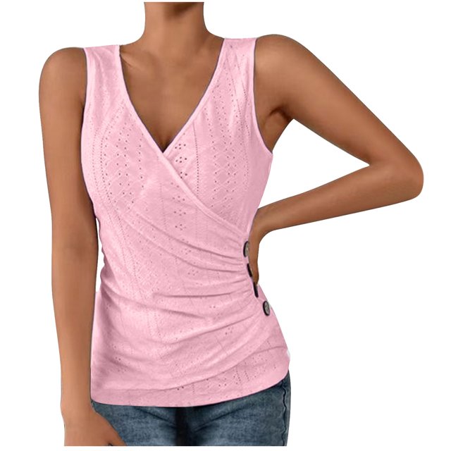 Timegard Womens Tank Tops Eyelet Deep V Neck Side Ruched Button Slim Comfy Sleeveless Tops Summer Beach