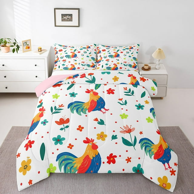 YST Hen Bedding Comforter Sets Colorful Animal Comforter Set For Girls Kids Cute Flower Animal Bedding Toddler, Farmhouse Animal Comforter Botanical Flower 3D Duvet Set (Pink Reverse)