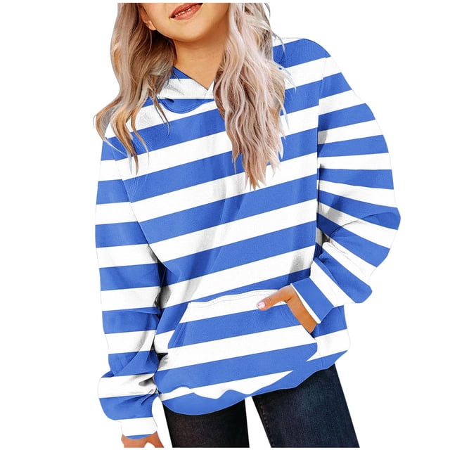 Milgrthf Cute Striped Hoodies for Girl Drop Shoulder Causal Loose Sweatshirt Long Sleeve Color Block Pullover Hoody with Pocket y2k Fall Outfits Blue 13 Years