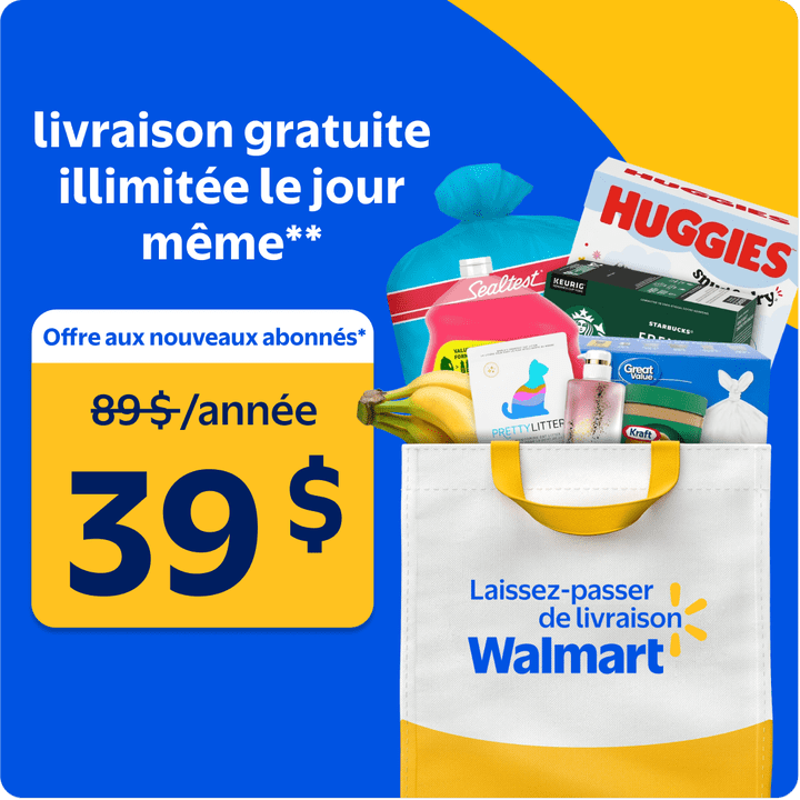 *Offre aux nouveaux clients du Laissez-passer annuel de livraison. Valide du 2 au 29 avril. Peut être modifiée en tout temps. Aucun ajustement de prix sur les abonnements antérieurs. Conditions complètes à Walmart.ca. **Vous devez passer votre commande, d'un minimum de 35 $, avant 15 h pour profiter de la livraison gratuite le jour même (avant taxes et frais), à l’exception de certains endroits.