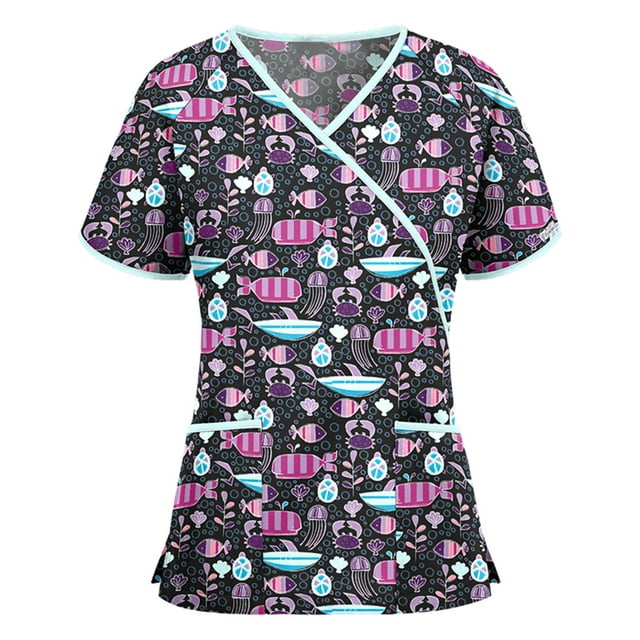 Heliisoer Blouse à Manches Courtes pour Femmes Col en V Uniforme de Travail Imprimé Dessin Animé