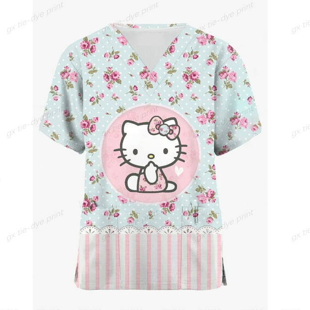 Jiayi Haut de Sarrau à Manches Courtes pour Femmes à Col en V avec Poche Hello Kitty, Imprimé de Dessins Animés, Régulierip