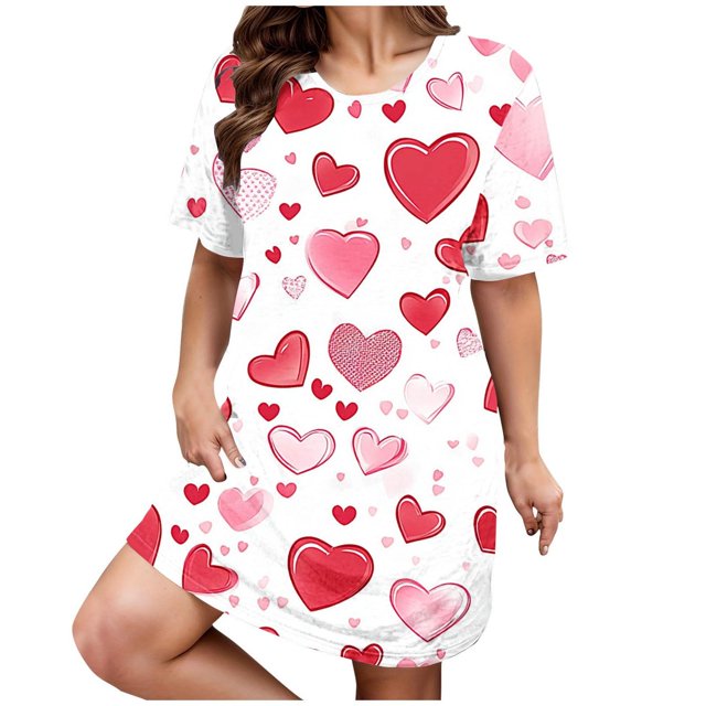 RANJIE Chemise de Nuit Grande Taille pour Femmes Imprimé Cœur Manches Courtes Col Rond Robe de Nuit Ample pour la Saint-Valentin, Rouge 3TG