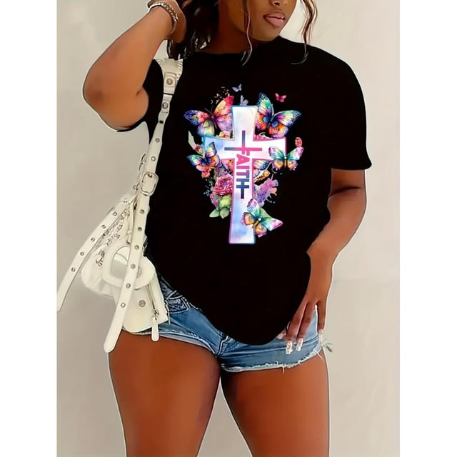 T-Shirt de Mode pour Femmes avec Croix Imprimée, T-Shirt Simple et Décontracté à Col Rond Confortable, T-Shirt de Sport Décontracté pour Femmes