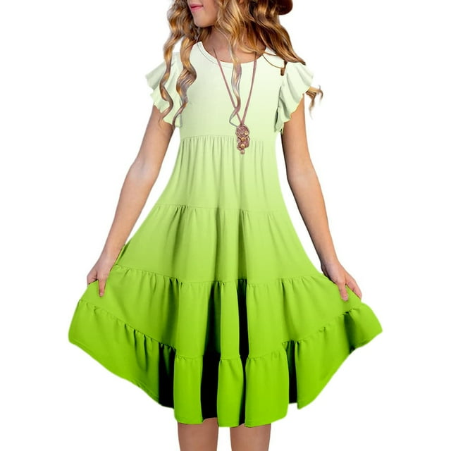 WERYOUNG Robes Filles Été Décontracté Mode Dégradé Manches Volantées Robe Évasée Robe Bohème Mode Filles Fête Robe Ligne A Robe d'Été, Vert Clair1, 14-15 Ans